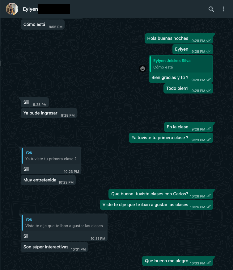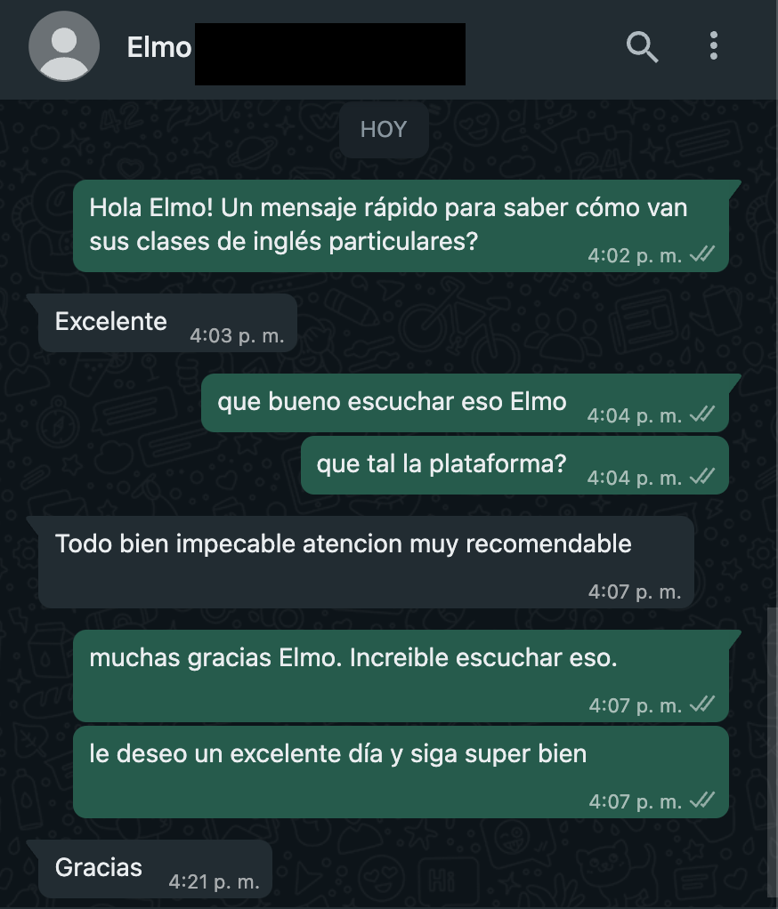 Senior Sales ManagerExcelentes clases, 100% recomendables metodología a través de vídeo llamada y adicionalmente cuenta con la plataforma que es super práctico, las clases son dinámicas y con revisión al instante.