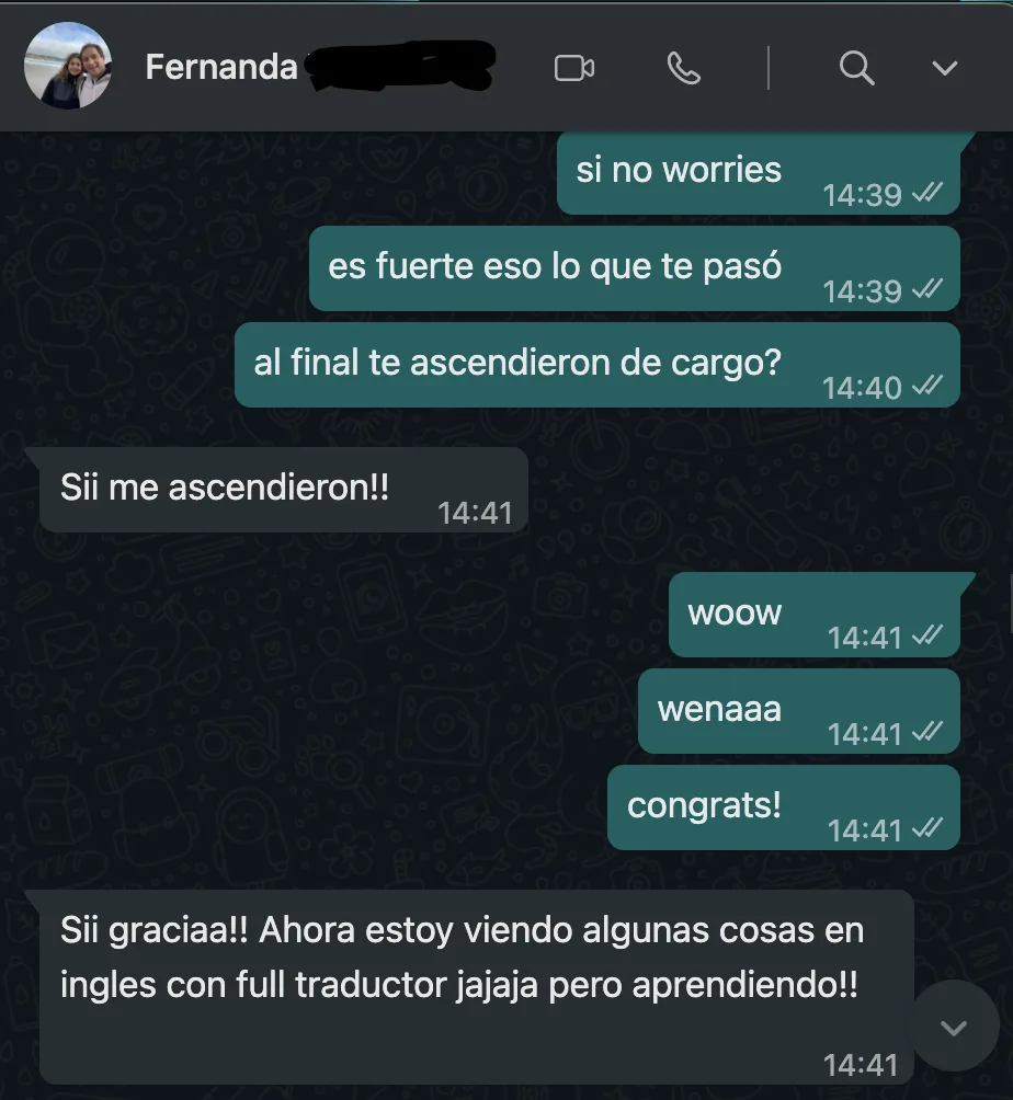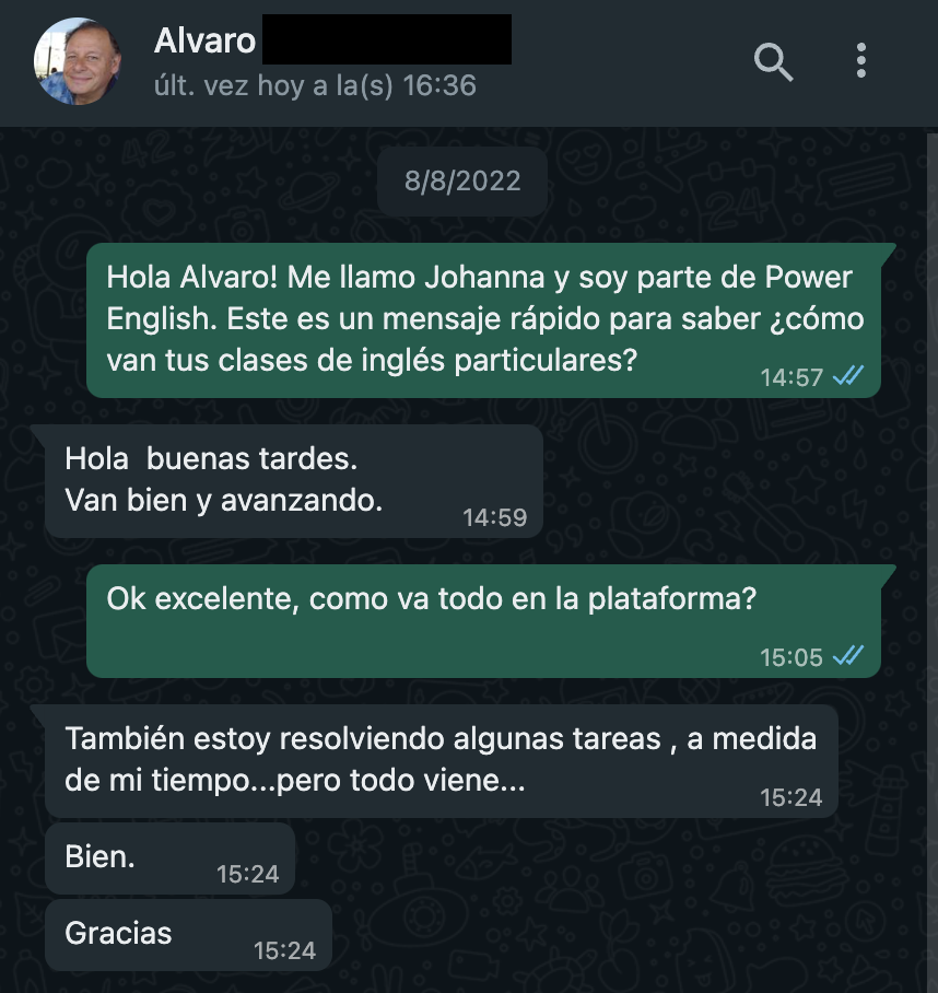 Gerente GeneralMuy buena experiencia con Power English, mi profesor me ayudó a enfrentar mi bloqueo de aprender inglés de una manera mucho más lúdica, de práctica real y con una metodología innovadora derribando lo tradicional conocido hasta ahora 👍 recomendación total