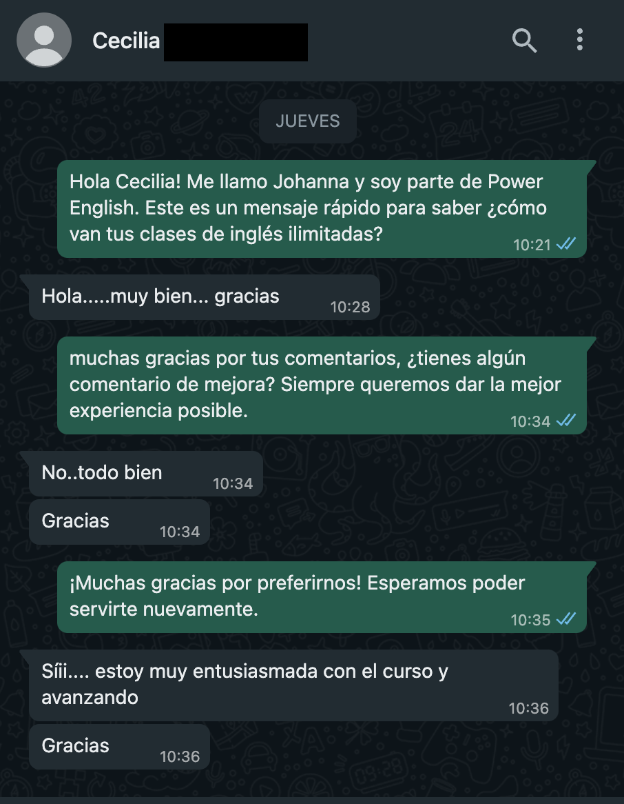 Tuve la oportunidad de tomar clases con Power English durante casi 10 meses donde aprendí mucho más de lo que no logré durante 2 años en un Instituto, pude fortalecer mi base, aprender mucho vocabulario, conversar de temas relacionados a mi ámbito laboral en inglés y resolver muchas dudas.